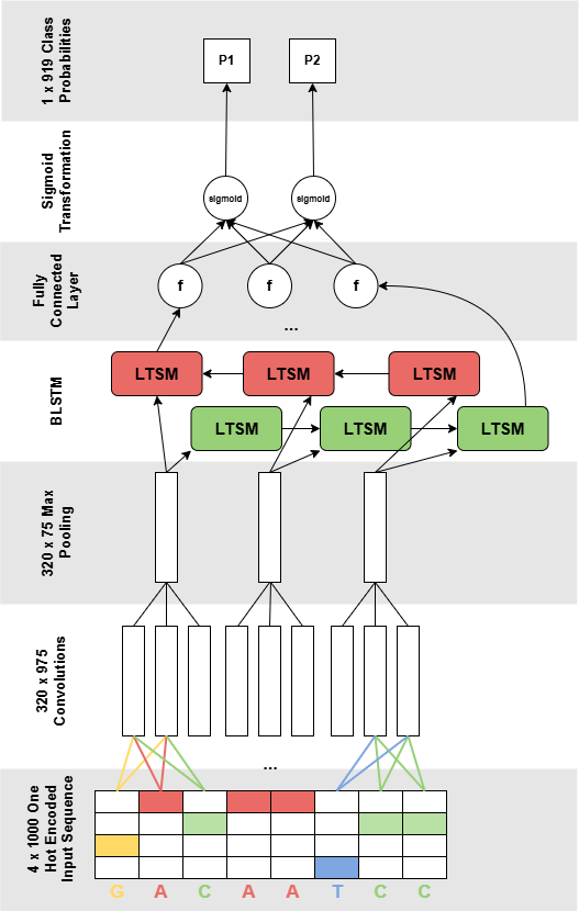 In collaboration with my colleague Yeshwanth Konka, I implemented and tested the Hybrid Neural Network described in the DanQ paper using modern frameworks and computing platforms in order to predict non-coding DNA function. The model architecture consisting of a convolutional neural network feeding into a bidirectional recurrent neural network is shown in the figure below.